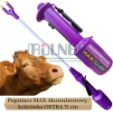 Poganiacz elektryczny MAX akumulatorowy o długości 71 cm z dużą ostrą końcówką to profesjonalne narzędzie do pracy w gospodarstwach hodowlanych. Dzięki wysokiemu napięciu impulsu 7000 V zapewnia skuteczne działanie nawet w przypadku zwierząt z grubą lub długą okrywą włosową.